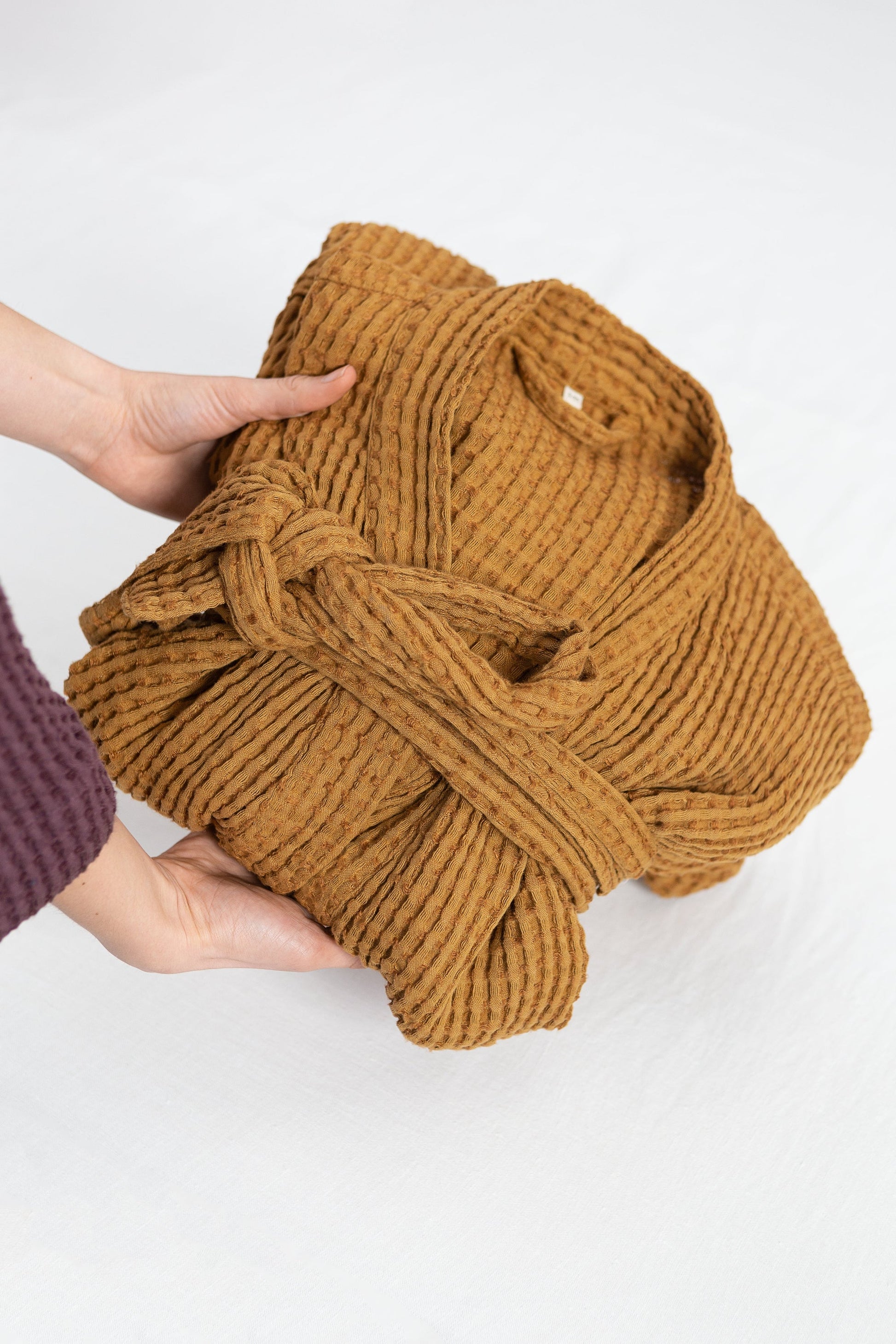 Set of linen waffle robes with towels