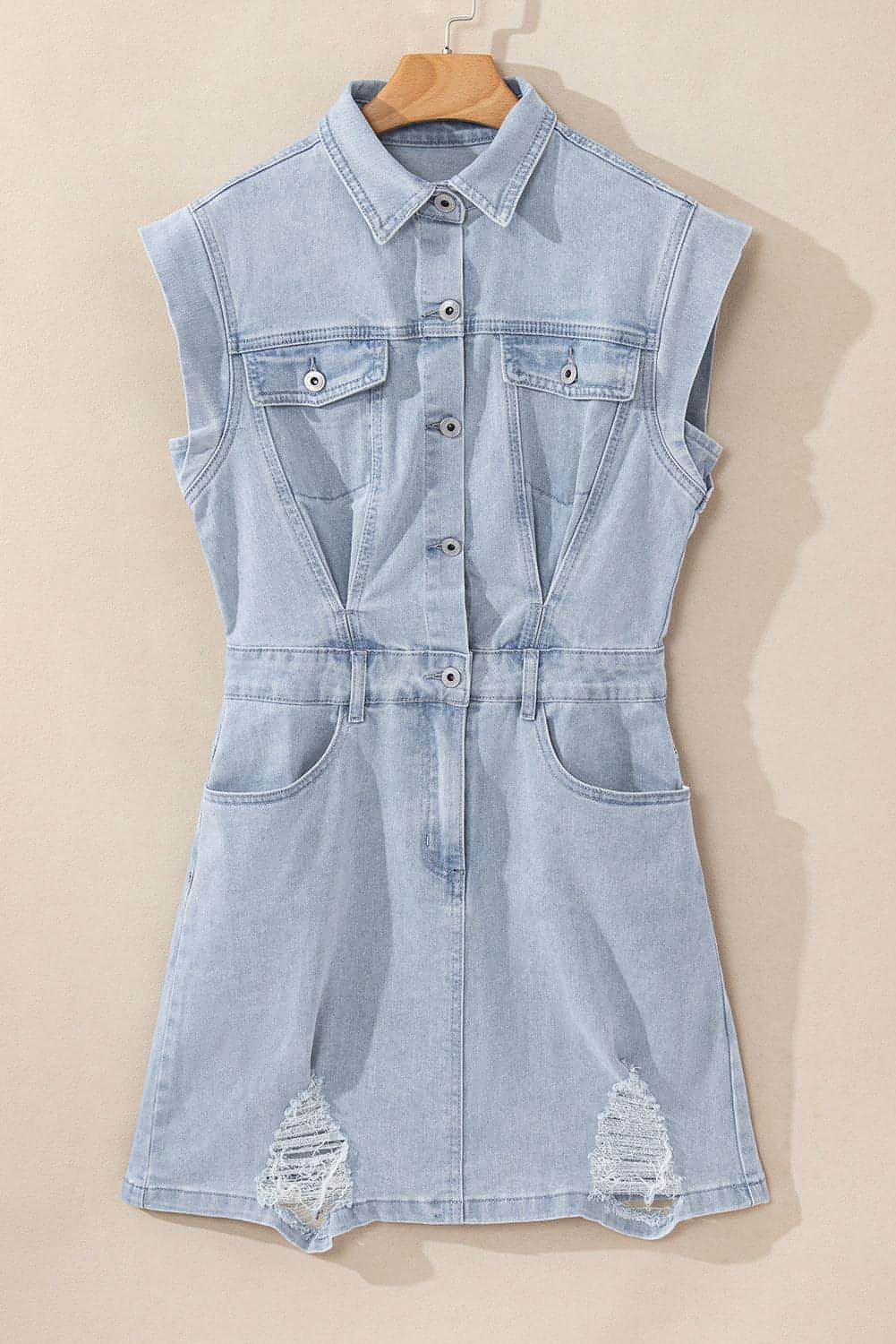 Light Blue Acid Wash Flap Pockets Frayed Denim Dress