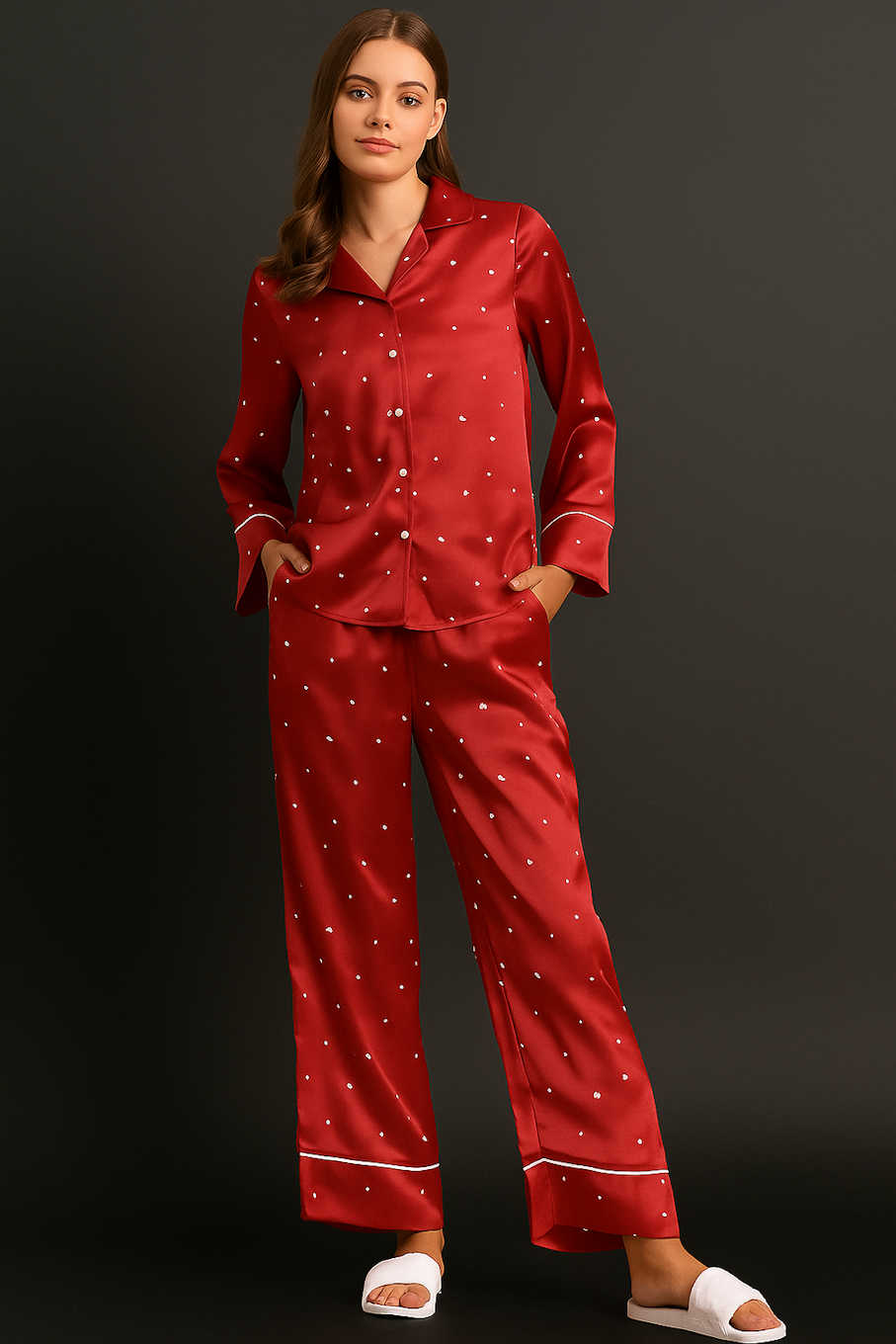 Elegant Red Satin Pajama Set with Polka Dots for Ultimate Comfort
