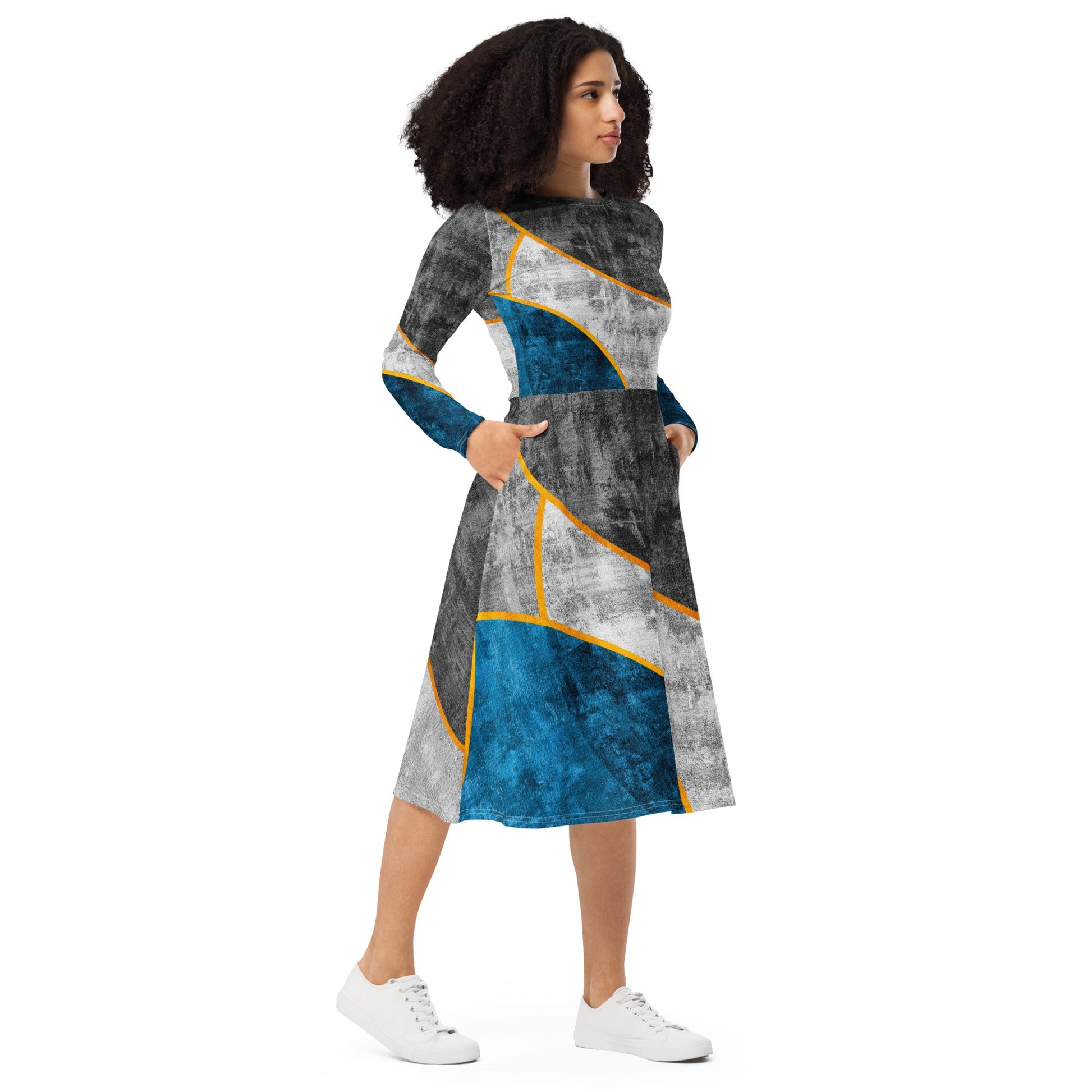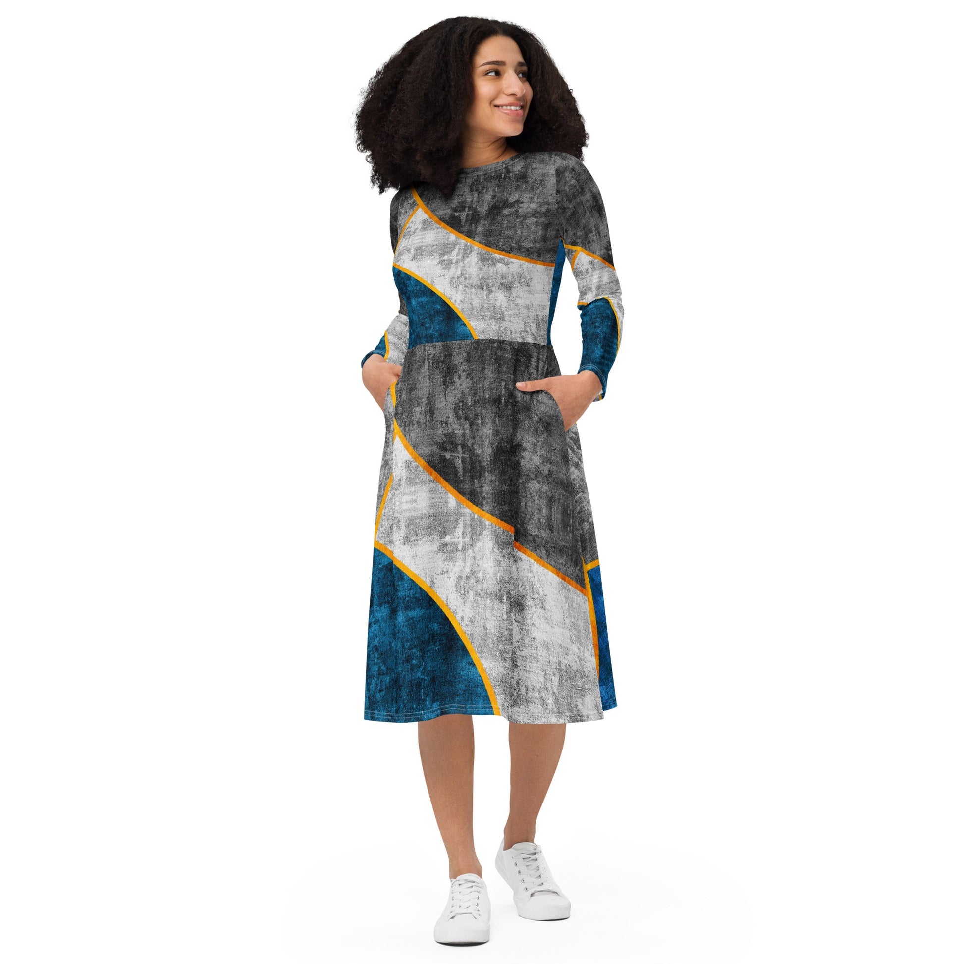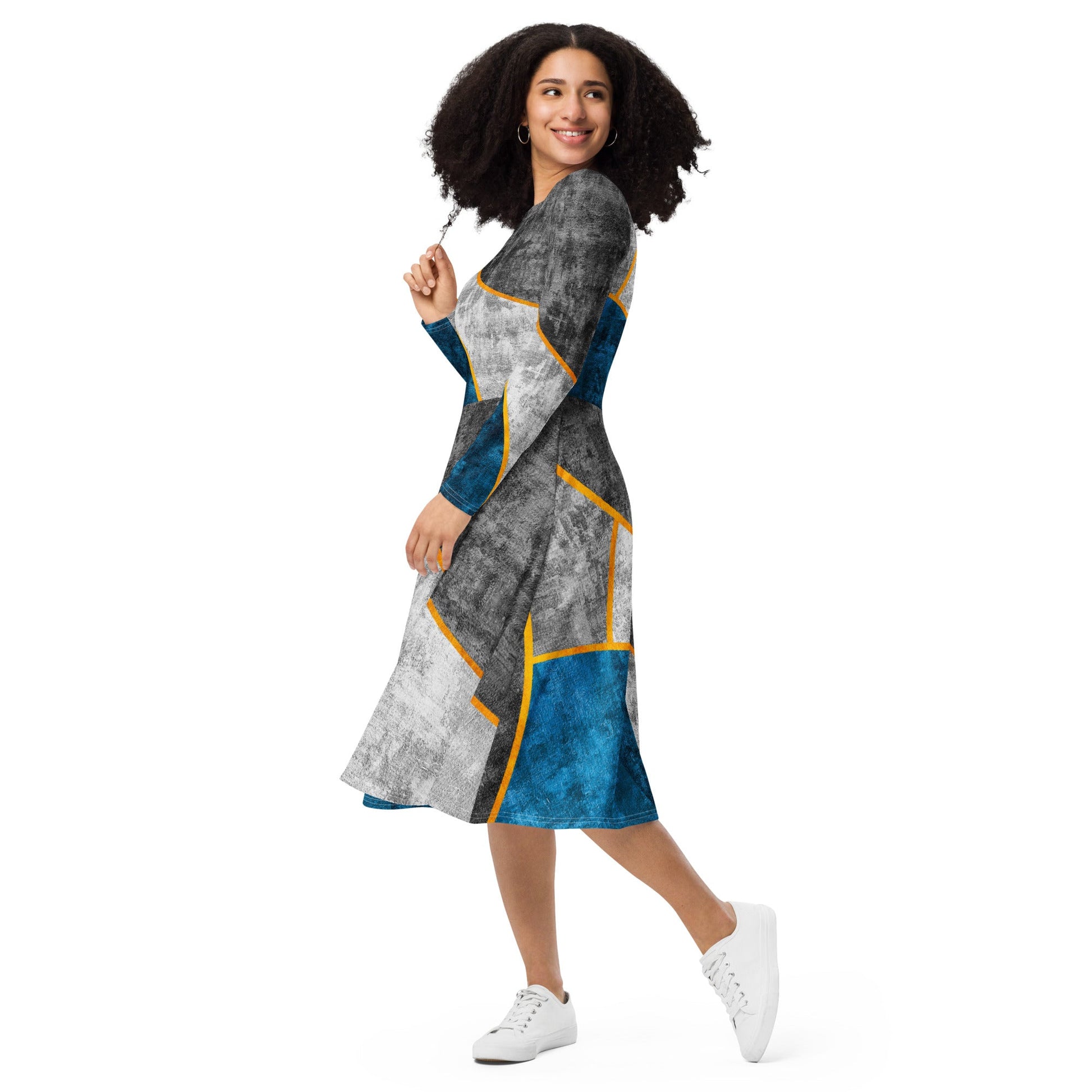 Womens Long Sleeve Midi Dress - Blue Grey Design