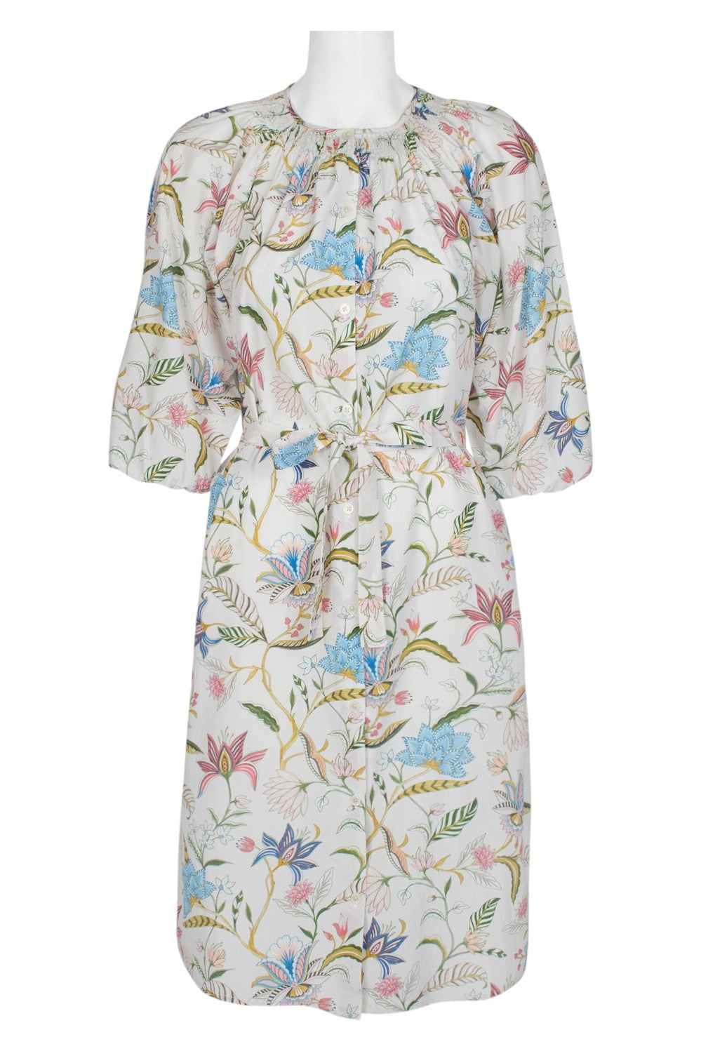 Tucker Crew Neck 3/4 Sleeve Tie Waist Floral Print Silk Cotton Dress