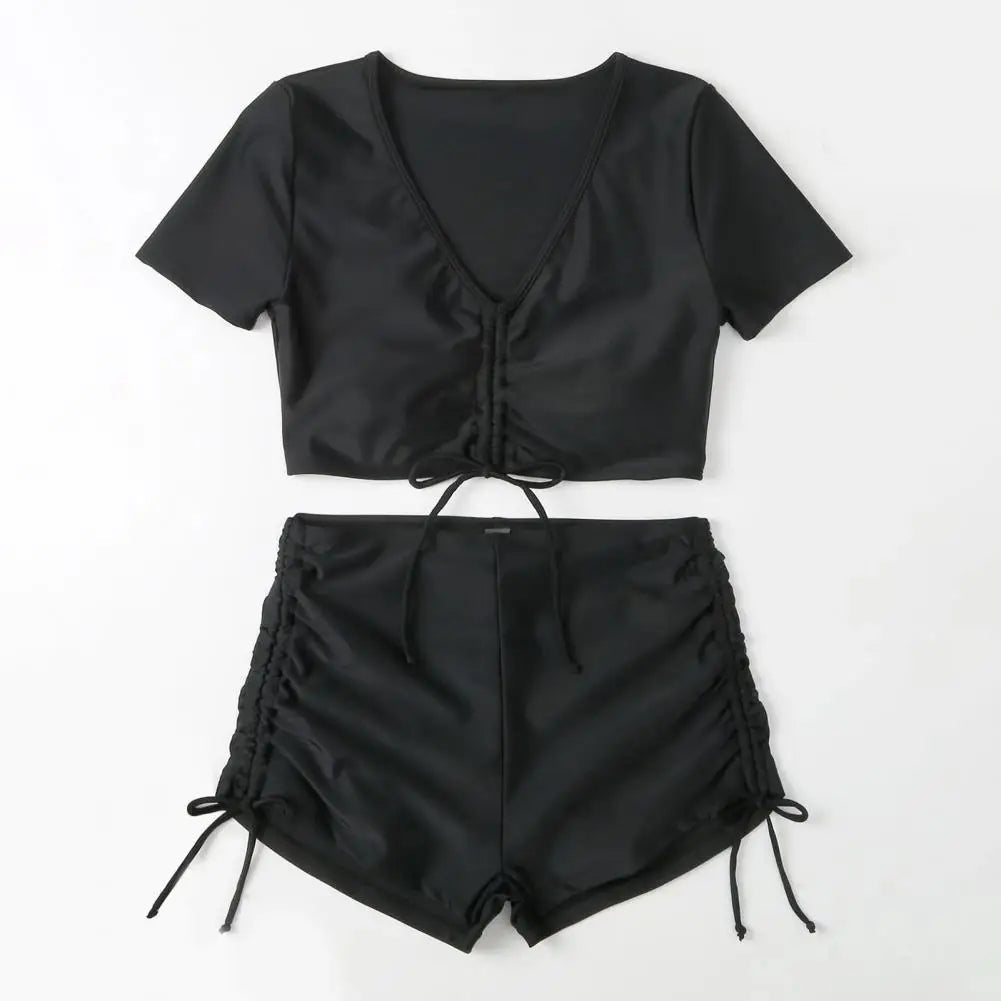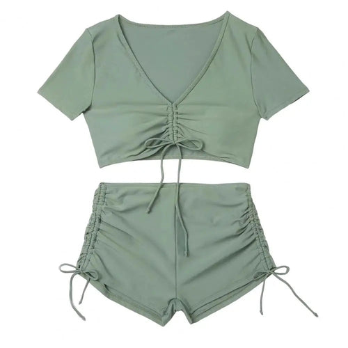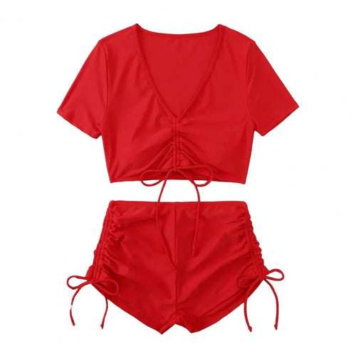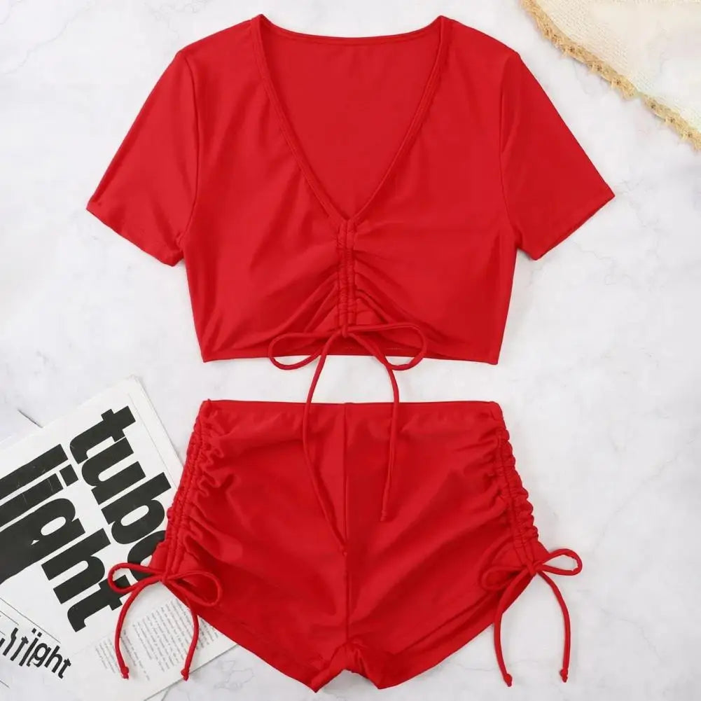 Women Summer Bikini Set V-Neck Short Sleeve Tops High Waist Drawstring