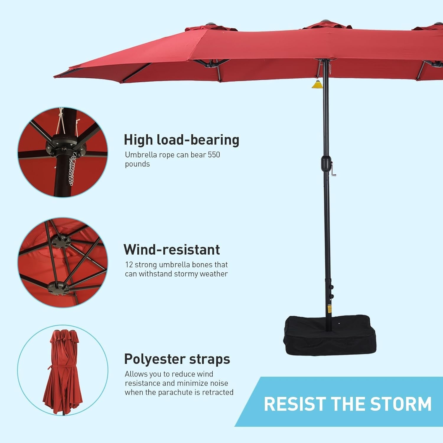 • Complete Set: Includes a durable base, cross base, two sandbags (150-180 lbs of sand required), and a protective cover for UV and dust protection.