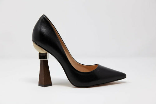 This super-soft Brazilian leather classic pumps are set-off with a 100mm geometric sculptural wooden stacked heel that turns this timeless style into a flirty conversation piece.
